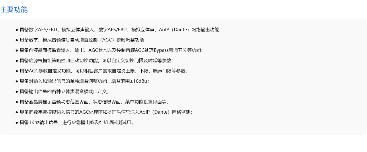 MW-9900ADi數(shù)字音頻處理器是廣播電視中心機房的重要設(shè)備。能使不穩(wěn)定音頻信號自動的進行處理,得到穩(wěn)定的輸出信號。對提高廣播電視節(jié)目制作、播出和傳輸質(zhì)量有顯著效果??蓮V泛應(yīng)用于調(diào)頻、調(diào)幅、單聲道和立體聲的廣播電臺、電視臺、發(fā)射臺及音像制作中心等。 采用先進DSP數(shù)字芯片開發(fā)的音頻處理平臺,可以自動處理專業(yè)AES/EBU數(shù)字音頻信號或模擬音頻信號,瞬時穩(wěn)定在設(shè)定好的動態(tài)范圍內(nèi)。內(nèi)置數(shù)字自動增益控制器AGC,可對數(shù)字AES/EBU和模擬音頻自動增益控制。用戶可通過預(yù)先設(shè)定的設(shè)備參數(shù),自動進行幅度和處理,輸出專業(yè)的數(shù)字AES/EBU、模擬音頻、AoIP(Dante)網(wǎng)絡(luò)輸出,有效地解決了廣播電臺、電視臺、發(fā)射臺音頻節(jié)目錄入或播出時聲音時大時小及傳輸過程中出現(xiàn)的節(jié)目聲音不均衡等問題,同時對發(fā)射機起到保護作用。用戶可根據(jù)需要選擇輸入音頻類型,也可根據(jù)設(shè)定的組策略使輸入音頻實現(xiàn)自動切換。系列產(chǎn)品在作為數(shù)字AES/EBU和模擬音頻的自動增益控制器的同時,還可作為數(shù)字AES/EBU、模擬音頻格式的轉(zhuǎn)換。 數(shù)字音頻處理器前面板中通過液晶面板顯示當前設(shè)備輸入音頻幅度指示、輸出音頻幅度指示、信號異常、AGC工作幅度狀態(tài)開關(guān)等;通過觸屏和按鍵旋鈕可進行功能參數(shù)修改。后面板包括一路數(shù)字音頻輸入和兩路數(shù)字音頻輸出;一路模擬立體聲音頻輸入和兩路模擬立體聲音頻輸出;一路AoIP(Dante)網(wǎng)絡(luò)接口;RS232+RS485+GPI/O的監(jiān)測及控制接口,可通過計算機對設(shè)備進行遠程控制、參數(shù)修改,設(shè)備包含內(nèi)置噪聲門限、斷電直通、bypass(旁通)開關(guān)等功能,保證在電源出現(xiàn)問題的情況下音頻通道依然暢通,帶電工作時也可通過bypass按鍵人工進行旁通處理。